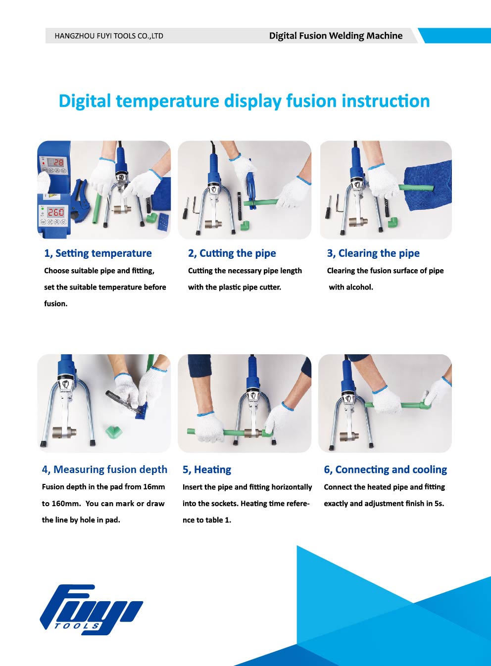 نحوه استفاده از دستگاه جوش فیوژن سوکت دیجیتال 1. تنظیم دما لوله و اتصالات مناسب را انتخاب کنید، دمای مناسب را تنظیم کنید 2. برش لوله برش طول لوله لازم با لوله برش پلاستیکی. 3. تمیز کردن لوله تمیز کردن سطح همجوشی لوله با الکل 4. اندازه گیری عمق فیوژن عمق فیوژن در پد از 16 میلی متر تا 160 میلی متر. می توانید خط را با سوراخ در پد علامت گذاری کنید یا بکشید. 5. گرمایش لوله و اتصالات را به صورت افقی در سوکت ها قرار دهید. مرجع زمان گرمایش به کتاب دستورالعمل در کیت. 6. اتصال و خنک کننده لوله و اتصالات گرم شده را دقیقاً وصل کنید و پایان را در 5s تنظیم کنید.